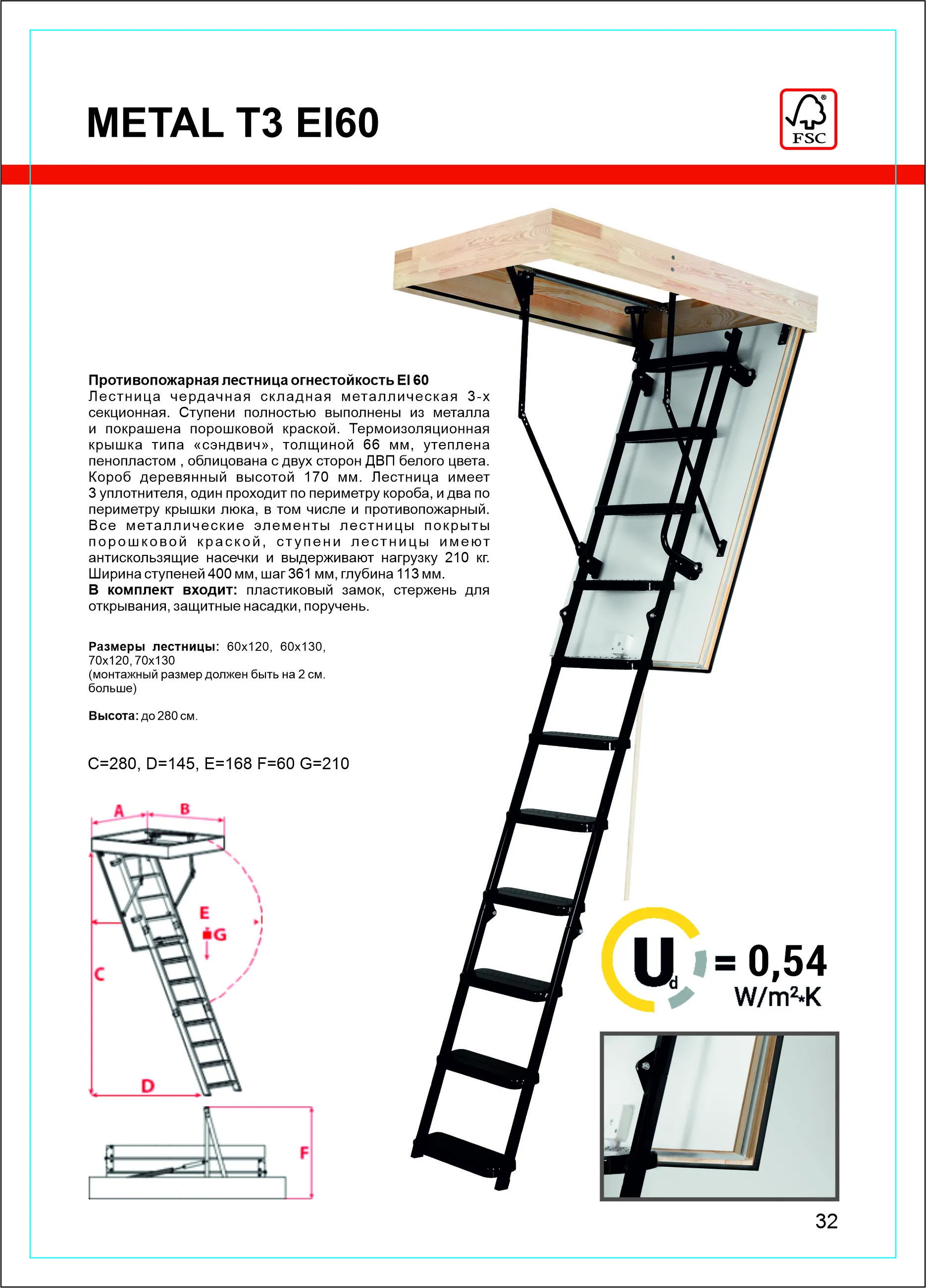 Противопожарная лестница, огнестойкость EI 60 Лестница чердачная складная металлическая 3-х секционная. Ступени полностью выполнены из металла и покрашена порошковой краской. Термоизоляционная крышка типа “сэндвич “, толщиной 66мм, утеплена пенопластом , облицована с двух сторон ДВП белого цвета. Короб деревянный высотой 170мм. Лестница имеет 3 уплотнителя, один проходит по периметру короба, и два по периметру крышки люка, в том числе и противопожарный.