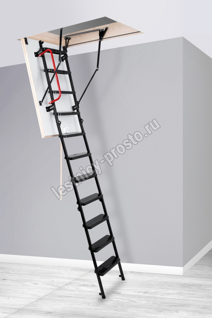 Лестница складная трехсекционная. Рабочая поверхность полностью выполнена из металла и покрашена порошковой краской. Термоизоляционная крышка типа "сэндвич", толщиной 47 мм, утеплена пенопластом, облицована с двух сторон ДCП белого цвета.