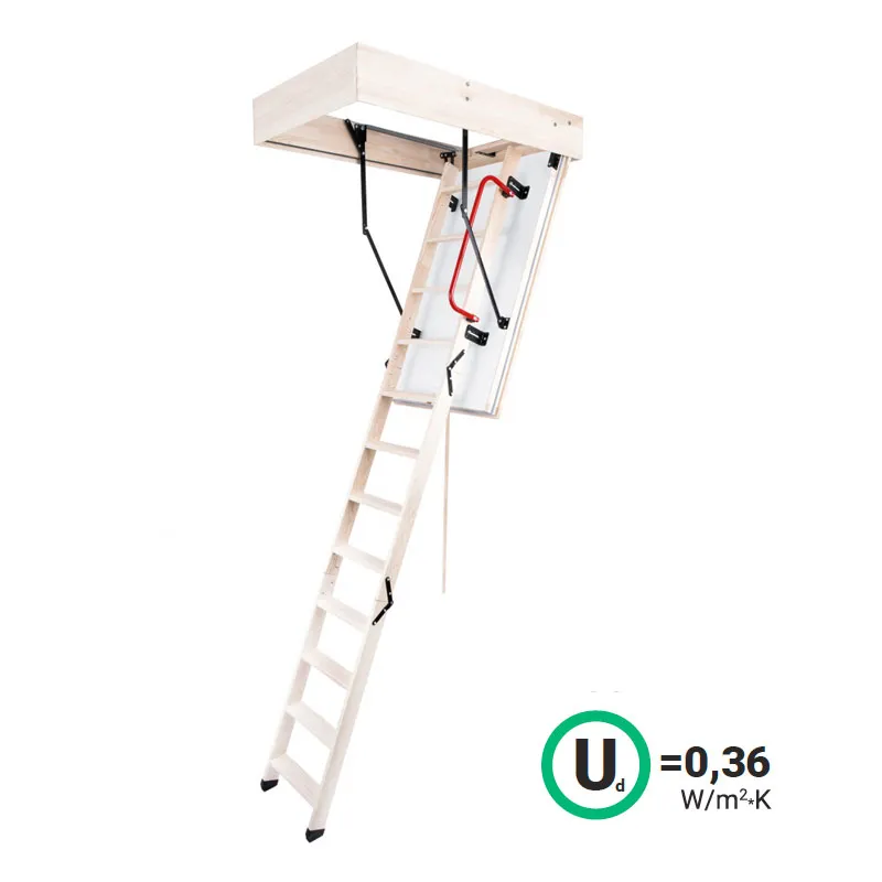 Лестница чердачная, складная, комбинированная 3-х секционная, металлические направляющие/деревянные ступени. Короб люка имеет двухточечную систему запирания. Телескопический поручень имеет внутреннюю пружину и при складывании лестницы служит механическим приводом, что облегчает процесс. Делает его полуавтоматическим. Оборудована дополнительной ступенькой на люке помогающей комфортно подниматься и спускаться. Термоизоляционная крышка типа "сэндвич", толщиной 86мм, утеплена пенопластом, облицована с двух сторон ДВП белого цвета. Лестница подходит для установки в местах с большими перепадами температур. Короб деревянный, высотой 170мм., по периметру проходит уплотнитель. Лестница выпускается для немецкого и английского рынка.