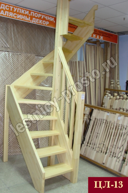 Компактная лестница из дерева. Удобный подъем засчет забежных ступеней и ограждений, которые входят в стандартную комплектацию. В стандартной комплектации столбы квадратные, балясины точёные. Элементы лестницы и ограждения поставляются в разобранном виде без какого-либо покрытия.