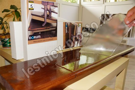 Нижняя поверхность покрыта специальным клеевым слоем для монтажа на поверхности лестничной ступени