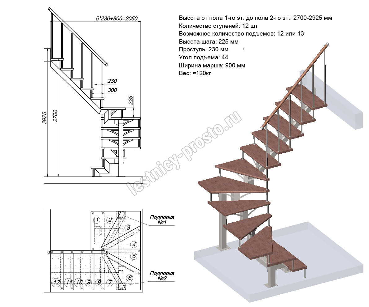 Высота лестницы 2700 - 2925 (12 ступеней) мм