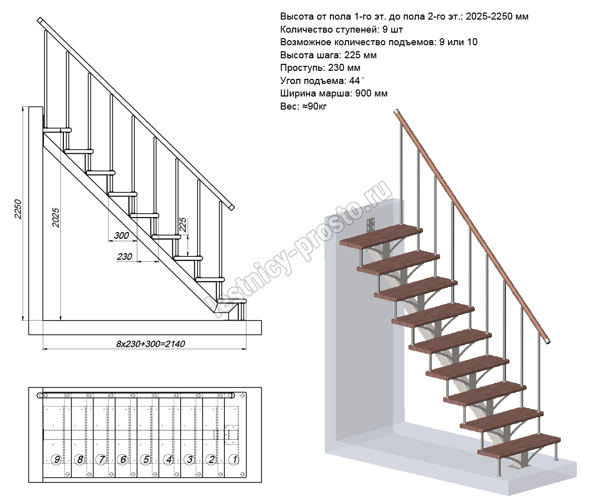 Высота лестницы 2025 - 2250 мм