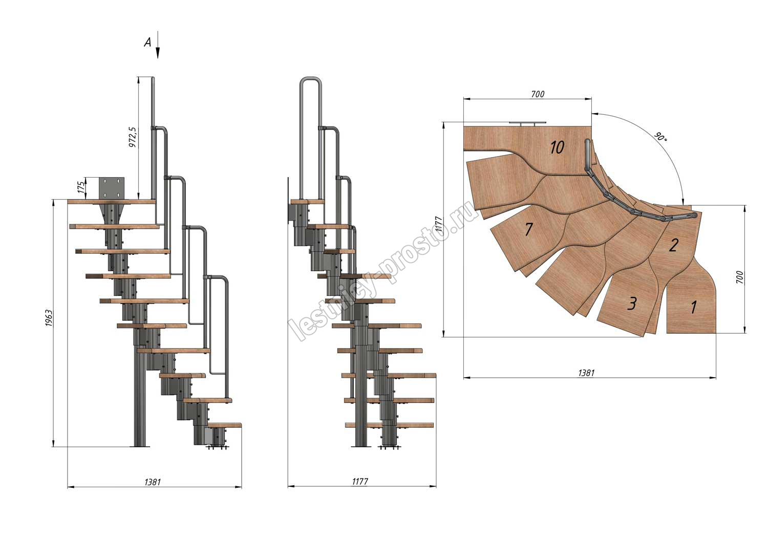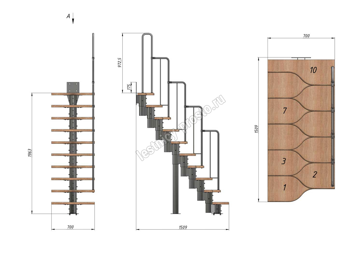 Лестница Prosto Urban Black гусиный шаг 700 мм, h180-264 см (10 ступеней), дуб