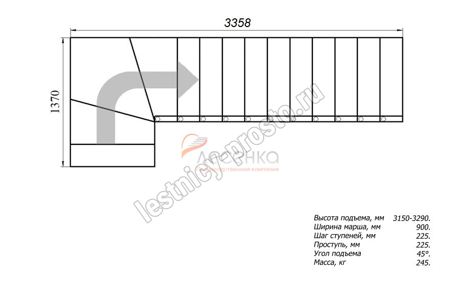 Модульная лестница Фаворит 225 3150-3290, Серый, Бук, Нержавеющая сталь