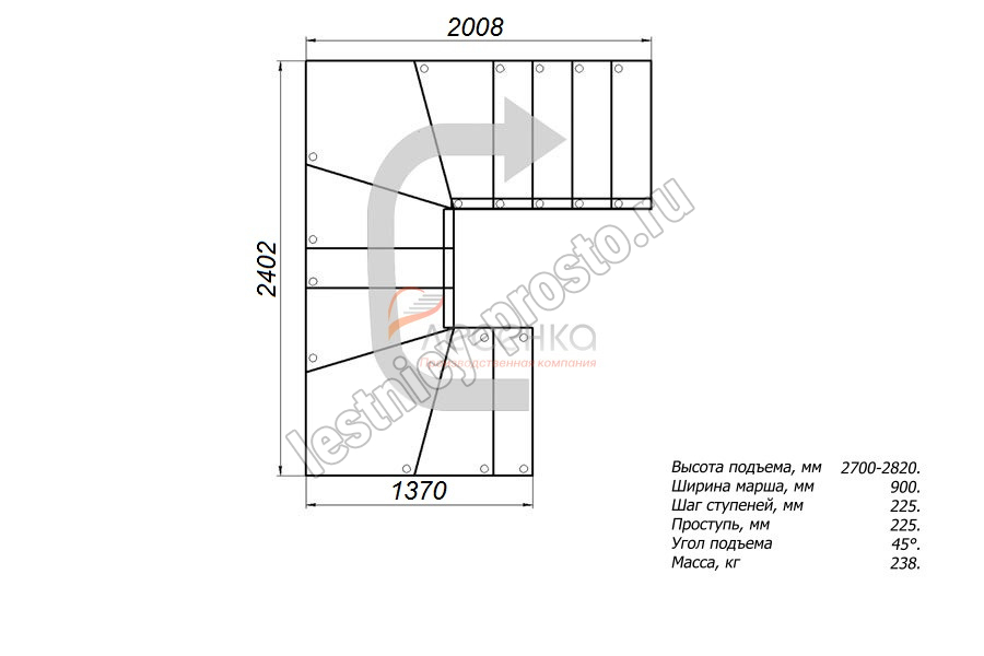 Модульная лестница Спринт 225 2700-2820, Белый, Лиственница, Нержавеющая сталь
