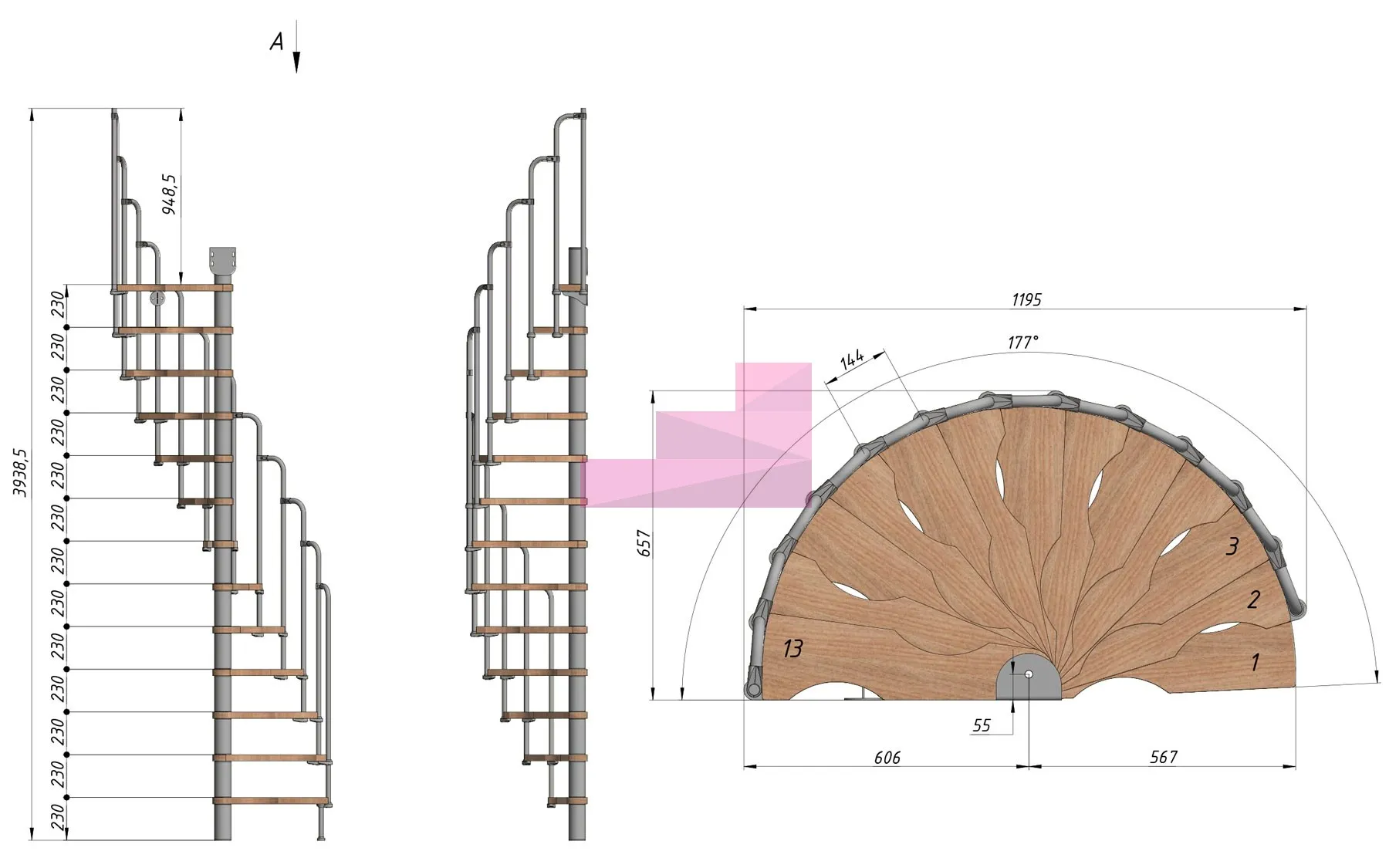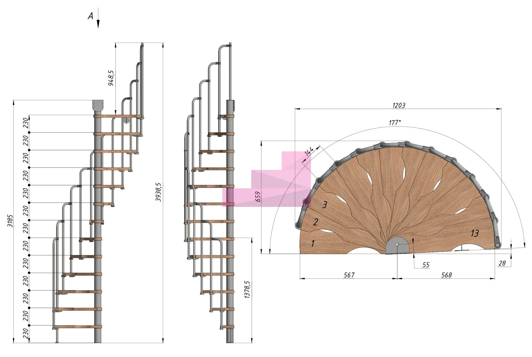 Высота лестницы 2990 - 3220 (13 ступеней) мм