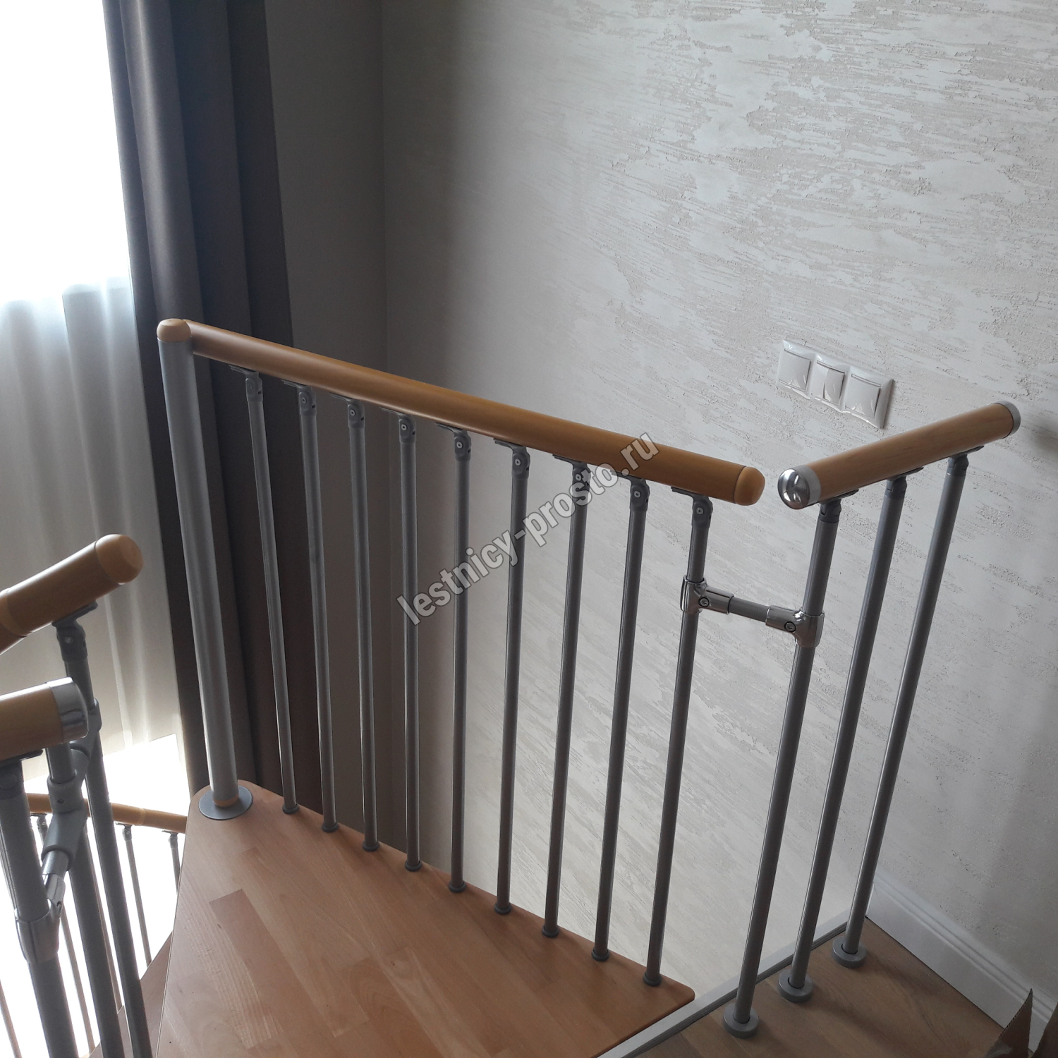 Поручень изготовлен из массива дуба в тон ступеням. Поручень и ступени лестницы покрыты износостойким защитным лаком.